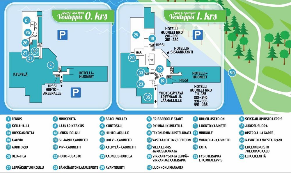 Vesileppis Areenan liikuntasalissa on käytettävissä välineet yleisimpiin pallopeleihin ja ryhmäliikuntatilasta löytyy erilaisia jumppavälineitä sekä jumppamattoja. Liikuntapaikat ovat hotellin välittömässä läheisyydessä. Jäähallille sekä Vesileppis Areenalla on hotellilta kulku yhdyskäytävää pitkin.